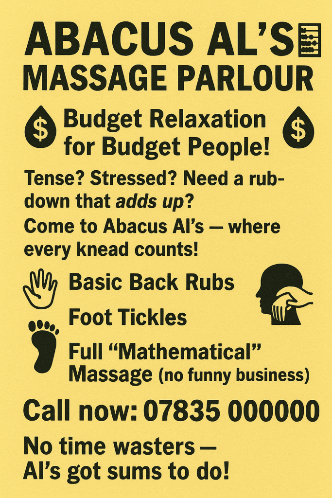 - Supporters Club treasurer, Abacus Al, will begin offering “massage” services in the Lewes area. Keep an eye out for his cards in local phone boxes. Take it easy with him, he’s got a bad back.