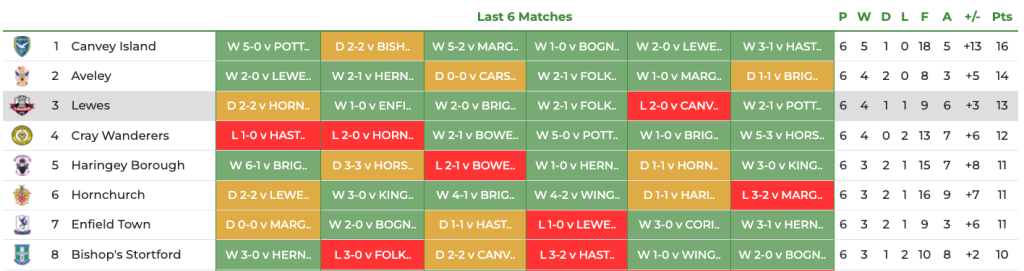 Lewes’s current form is certainly impressive. Based on the past six matches in the Isthmian Premier League, the club currently lie third: